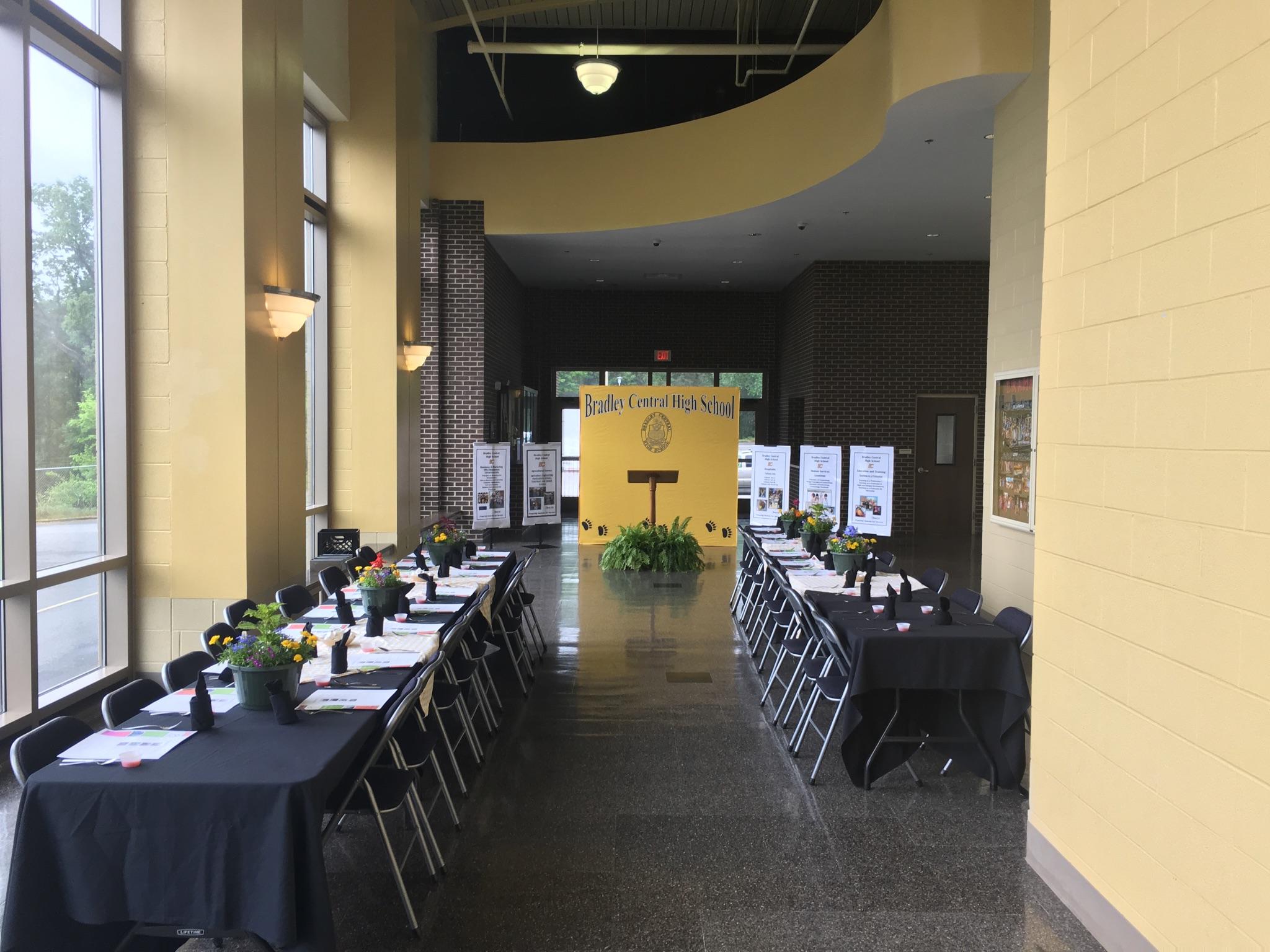 Bradley Central High School Career and Technical teachers and students hosted the Tennessee State School Board, members of the Bradley County School Board and County Commission on Friday April 22, 2016. The visit included lunch provided in the BCHS Fine Arts lobby prepared by Culinary Arts. Evan Wooden, Emily Carey, Autumn Johnson, and Morgan Mitchell, CTE students, shared the projects, successes, and classes of Bradley Central High School’s agriculture, business and marketing, and teaching as a profession programs. Paula Deal, cosmetology instructor, showcased integration and collaboration projects bringing relevance and engagement to the classroom. After lunch, tours were conducted in health science, mechatronics, welding, and machining classrooms. Tours outlined the focus and vision of Career and Technical Education: to provide the way for students to be ready to enter into college and career. Patrick Spangler, BCHS business instructor, presented the vision and served as the CTE representative for this luncheon. In Bradley County we are excited about the future of Career and Technical Education and even more excited about possibilities we can offer our students!