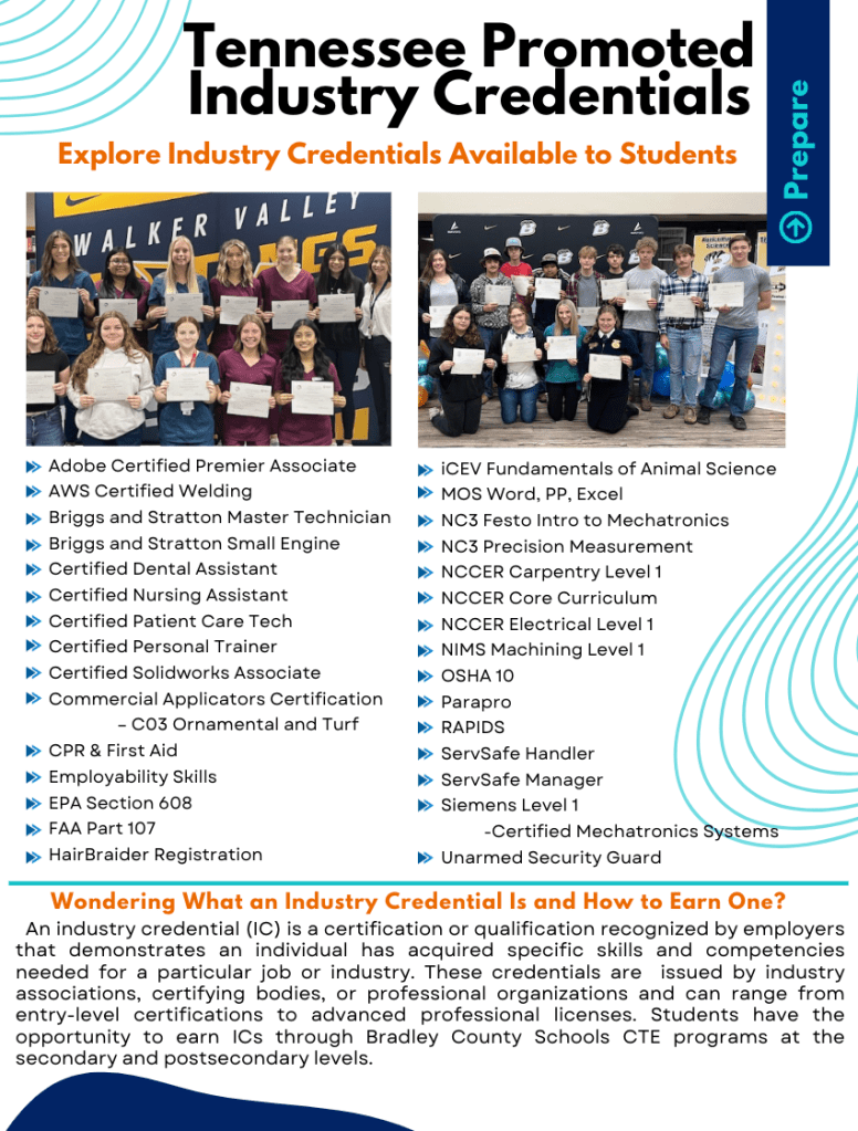 Preparing Career and Technical Education students for college and career includes more than average classroom instruction. In Bradley County our goal is for all CTE students to graduate with a diploma plus an experience which will make the transition to life after high school more seamless. CTE Graduation Plus includes leadership opportunities in Career Technical Student Organizations through Competitive Events and Regional and State Offices, skill development through Industry Certifications, Work Keys Proficiency, and Portfolios, business experience through Work-Based Learning/Internships/Capstone Classes, and early college credits through Dual Credit/ Dual Enrollment. All of these experiences increase the soft skill development employers are seeking and provide students with a jump start to the future. Check out the pages under the Graduation Plus tab to learn more about the opportunities in CTE!